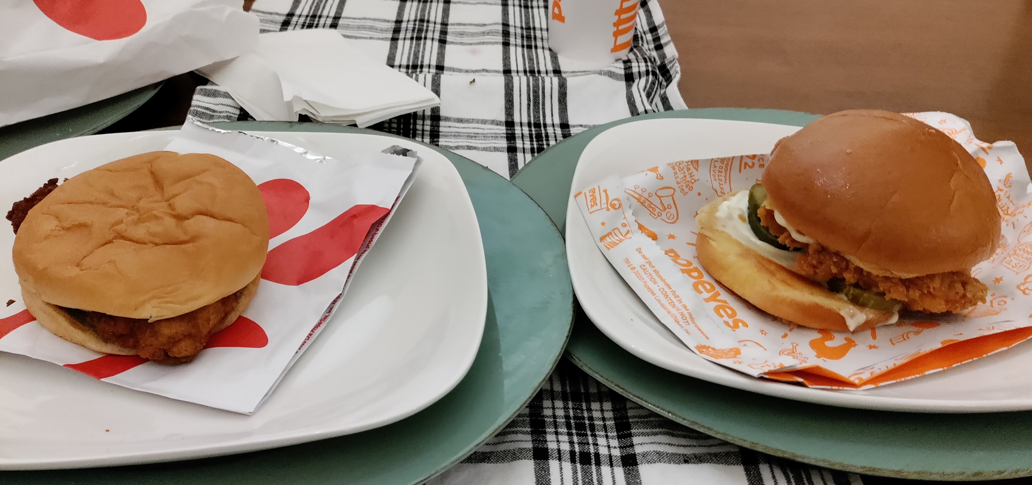 Chick-fi-A vrs Popeyes For the longest time I have always wanted to do a taste test between the Chick-fil-A and the Popeye’s chicken sandwiches. A few years back, I remember when there was a debate between which was the best chicken sandwich and if memory serves me correctly, it caused an outage of Popeye’s chicken sandwich. Anyway, tonight is the night for me to finally give it a try. Yes, I am always years behind every one else. That is how I roll. When there is a new hot show on TV or streaming, I don’t start watching it. I tend to wait years later to check it out. Well, there are a couple of exceptions but, I digress.